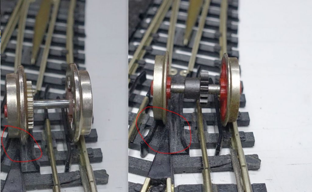 Dieses Bild der Express-Achse links und der 2L-Achse rechts zeigt das Problem: Das 2L-Rad läuft in der Weiche gegen das Herzstück und entgleist. Wie wir solche Fahrzeuge für unser System tauglich machen können, möchte ich im folgenden zeigen